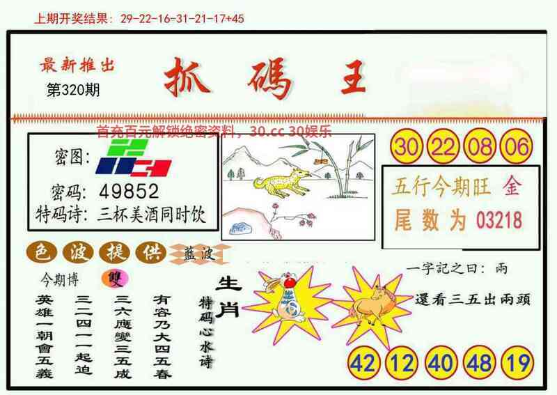 【精解抓码王】开(羊47) 322期:最传绣色桃花里 【主攻抓肖】鸡狗龙虎马羊鼠蛇兔 【抓码尾数】04579 【抓码双波】绿蓝波 |